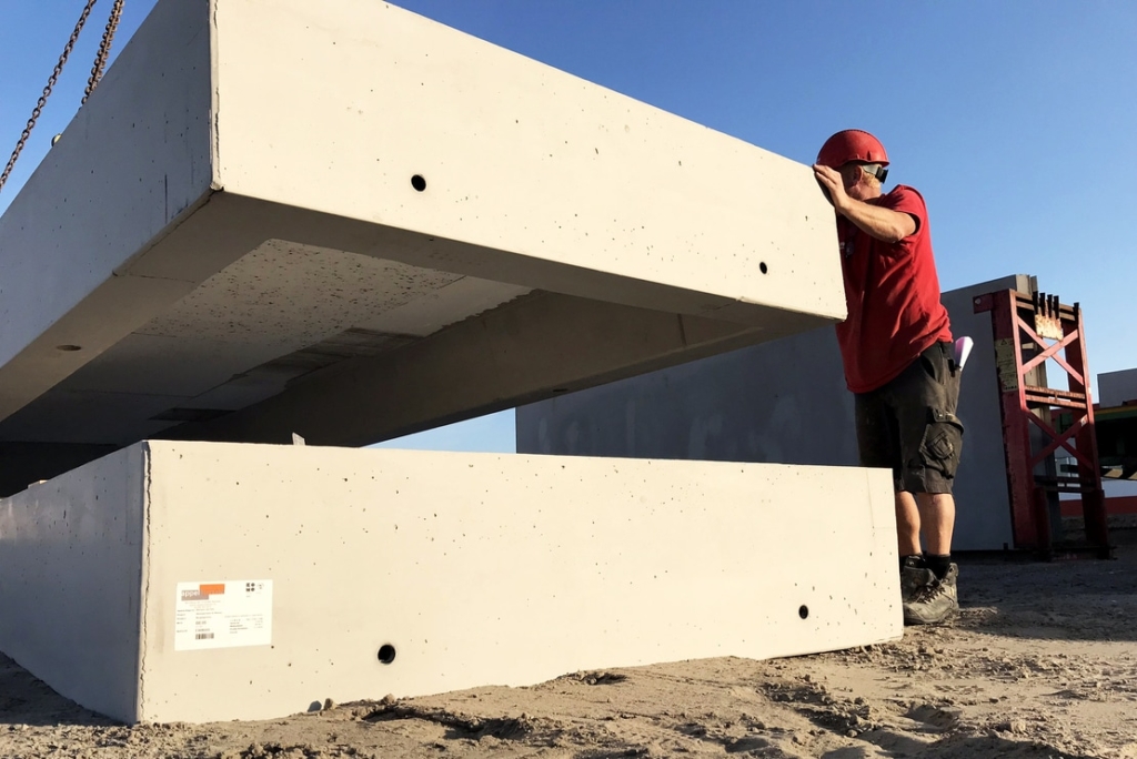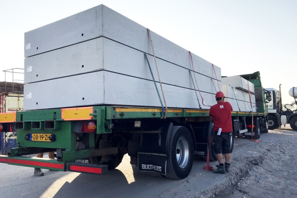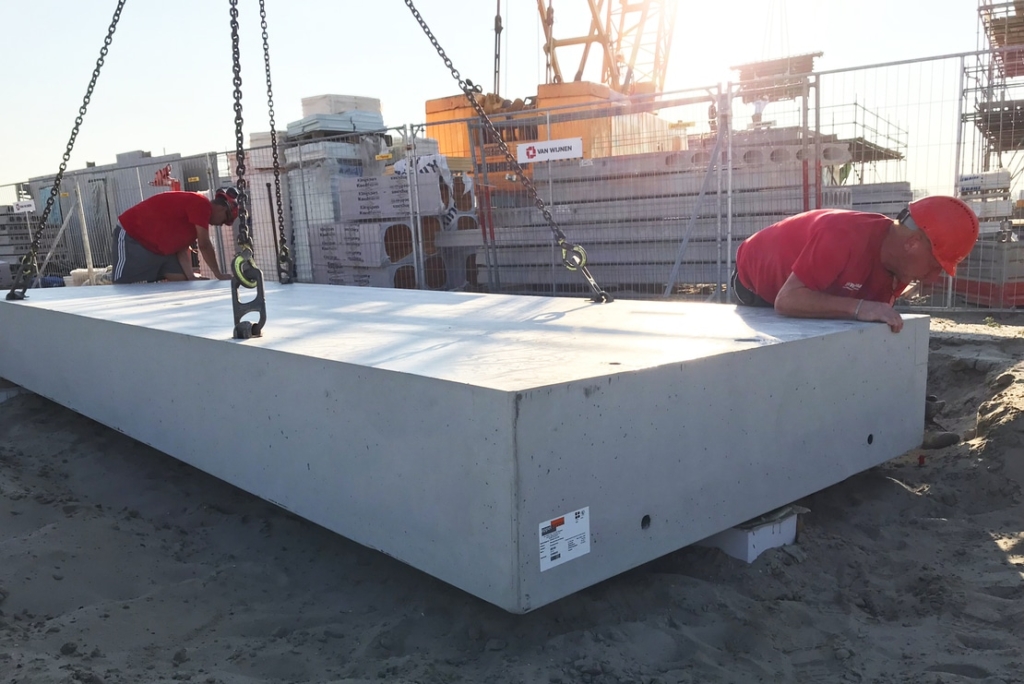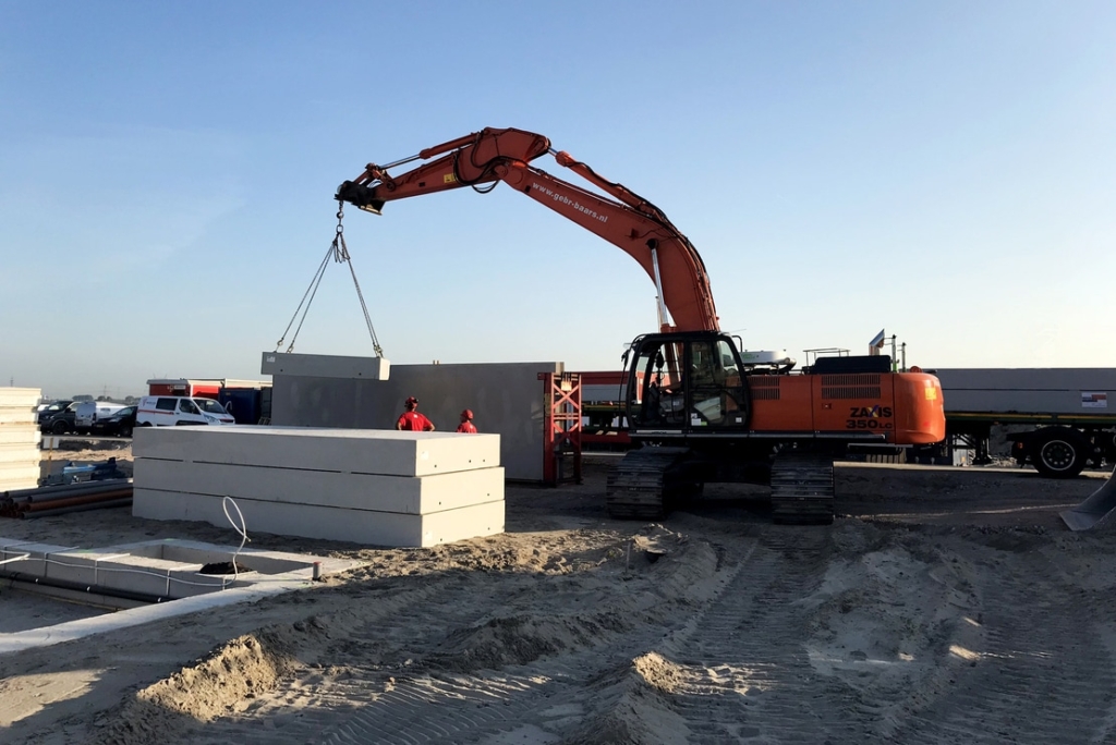 In den Hintergärten werden den Bewohnern auf vorgefertigten Betonsohlplatten gegründete Abstellräume zur Verfügung gestellt. Die Sohlplatten werden im Werk hergestellt und anschließend als jeweils 25.000 Kilogramm schwere Fracht zur Baustelle nach Weesp transportiert. Dort werden die Sohlplatten von unserem Montageteam ausgelegt und an den Rammpfählen befestigt.