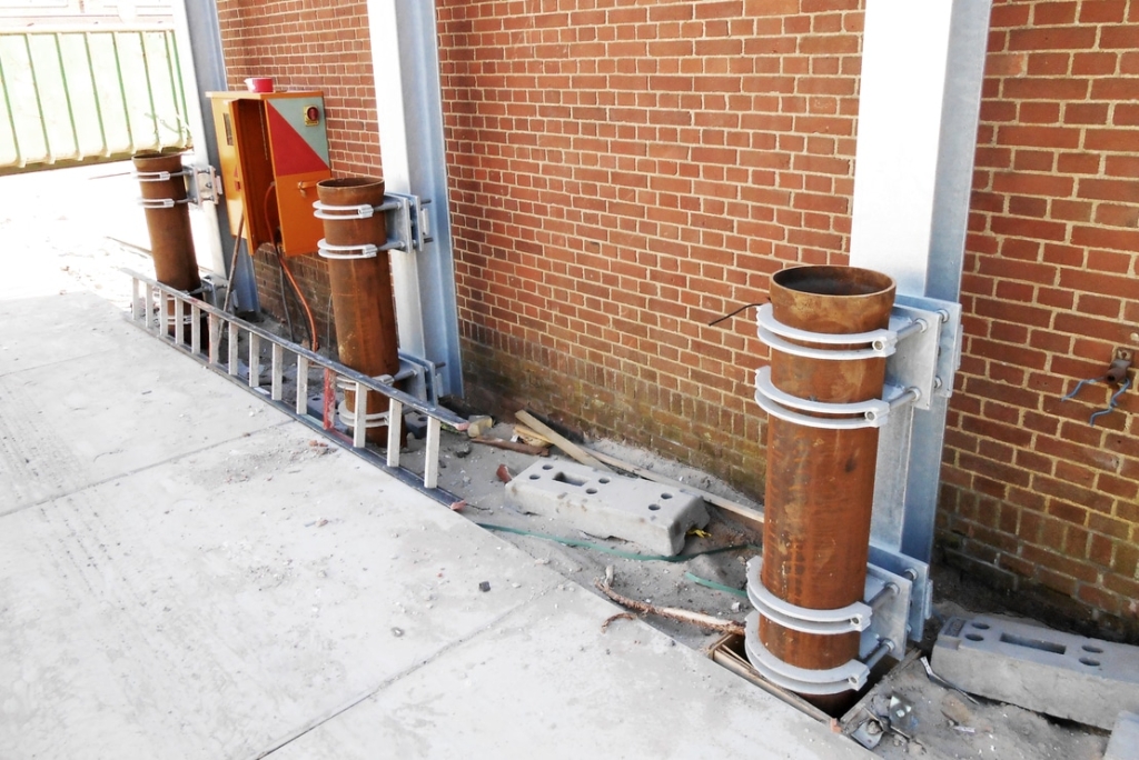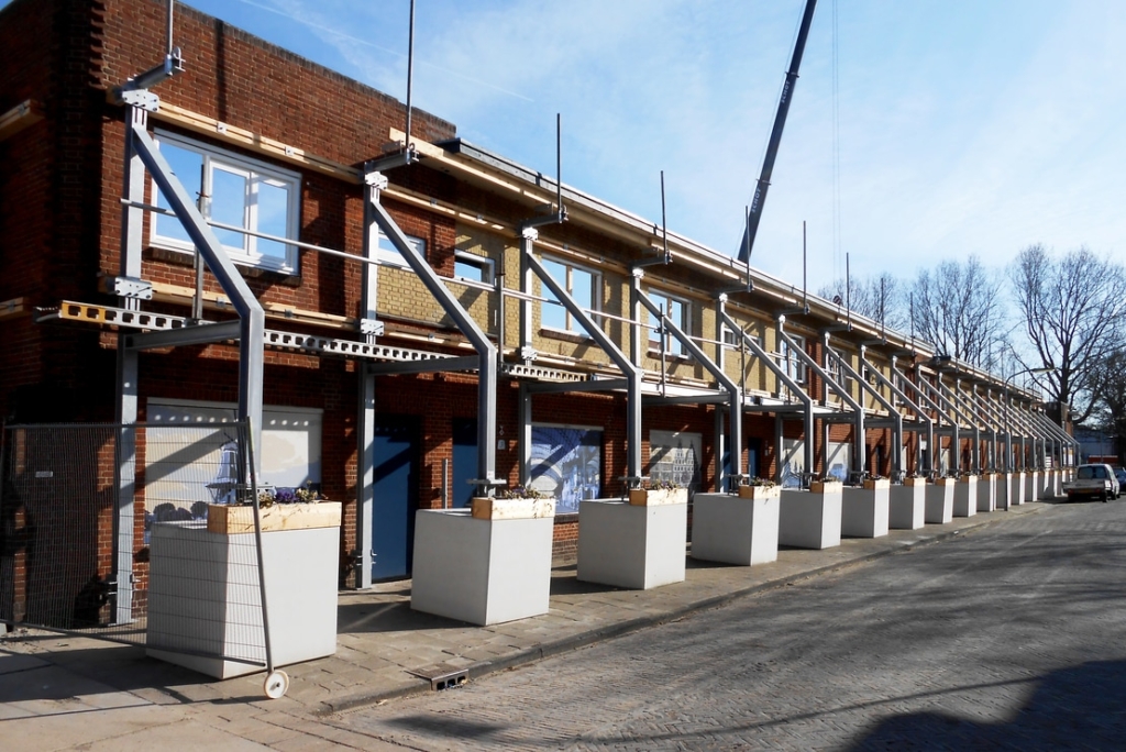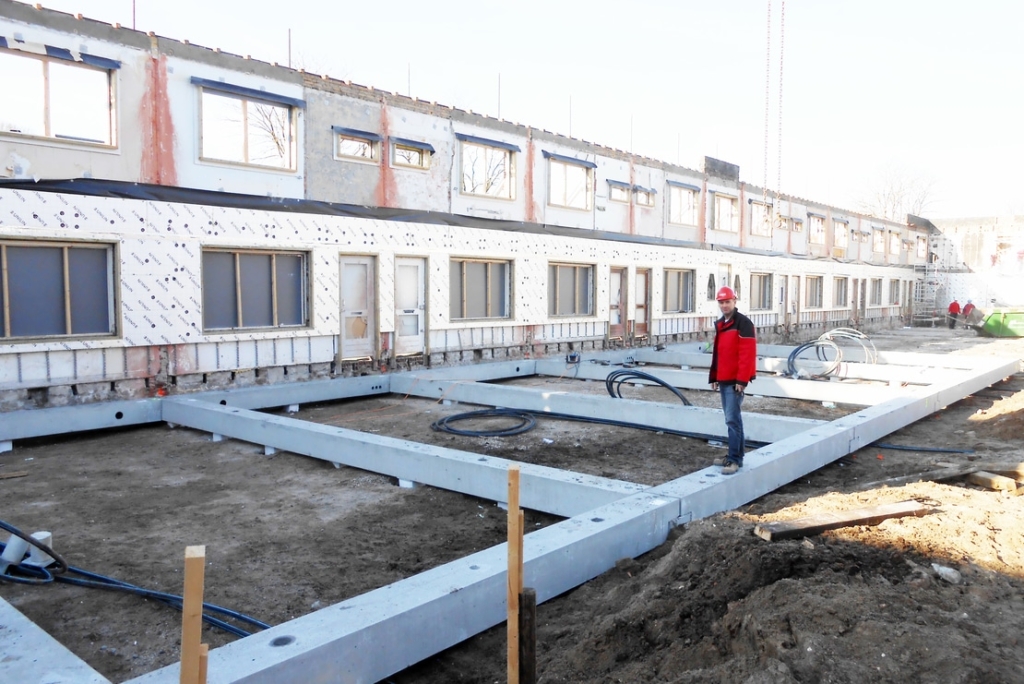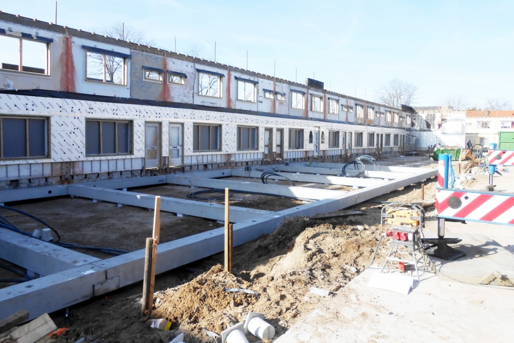 Hinter den bestehenden Giebeln werden von uns neue Prefab Gründungsbalken gesetzt, auf denen die Fundamente der neuen Häuser gestürzt werden. Um die ‚alten‘ Giebel während der Montage der Prefab Gründungsbalken und dem Bau der neuen Häuser aufrechtzuerhalten, wurde am Vorgiebel eine Stützkonstruktion angebracht.