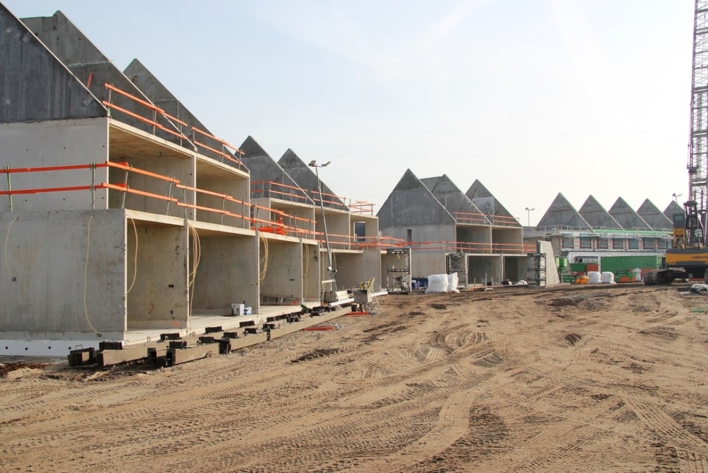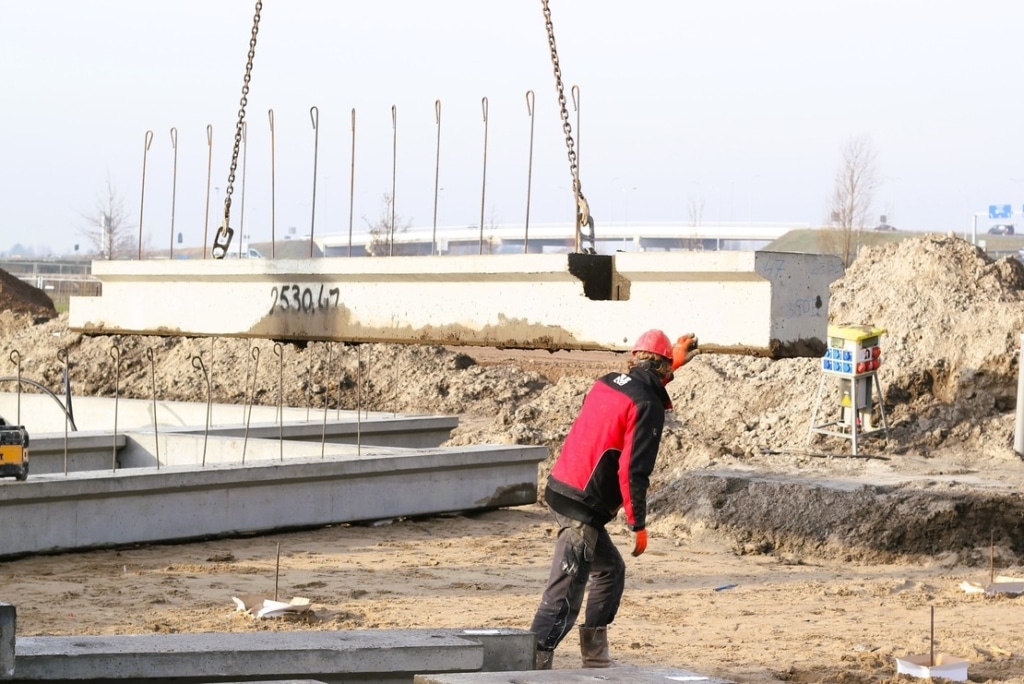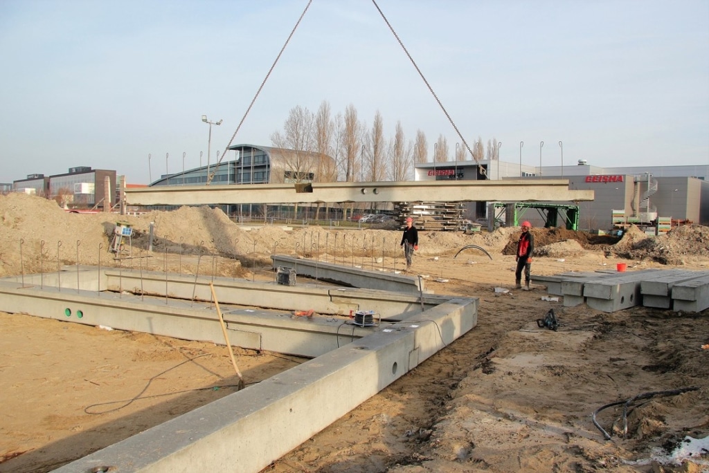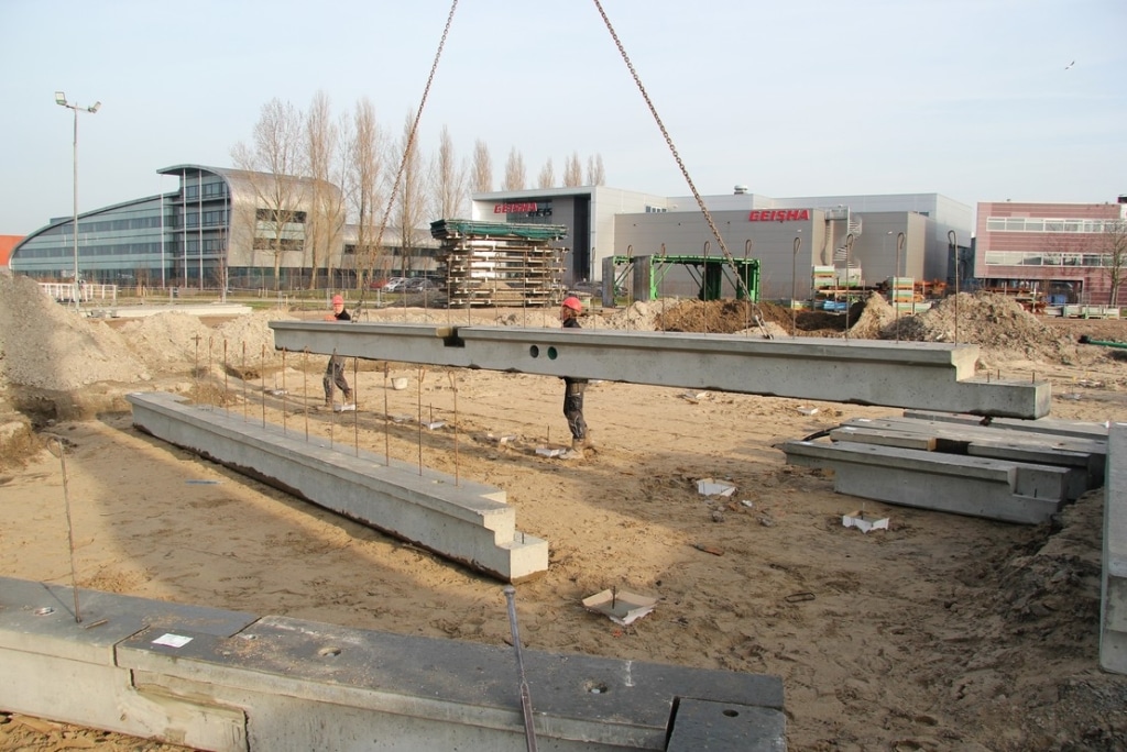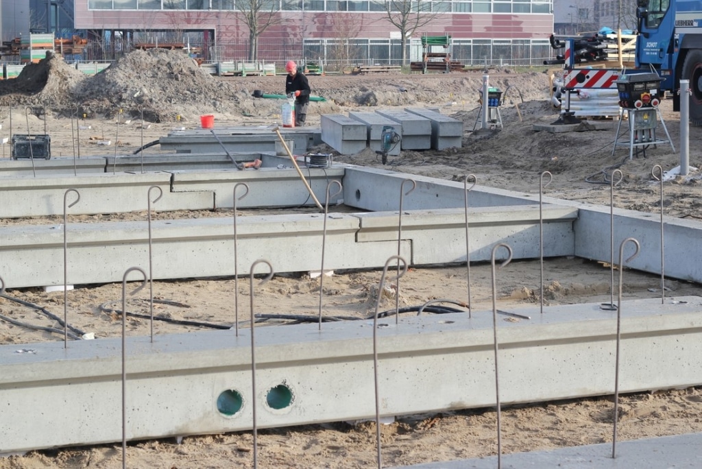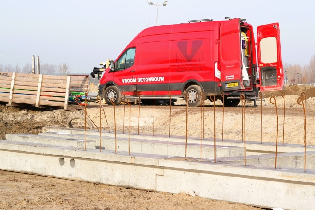 Für das Bauunternehmen ‚BAM Wonen Nieuwbouwconcepten‘ ist es mittlerweile eine vertraute Zusammenarbeit mit den beiden Vroom-Geschäftsbereichen. Im November 2022 begannen wir mit dem Einbringen der vorgefertigten Pfähle, auf denen sofort die vorgefertigten Fundamentbalken montiert wurden. Nach Abschluss der Rammarbeiten  brauchten wir nur noch eine kurze Zeit für die Montage der restlichen Fundamentbalken, anschließend konnten die nächsten Bauphasen in Angriff genommen werden.