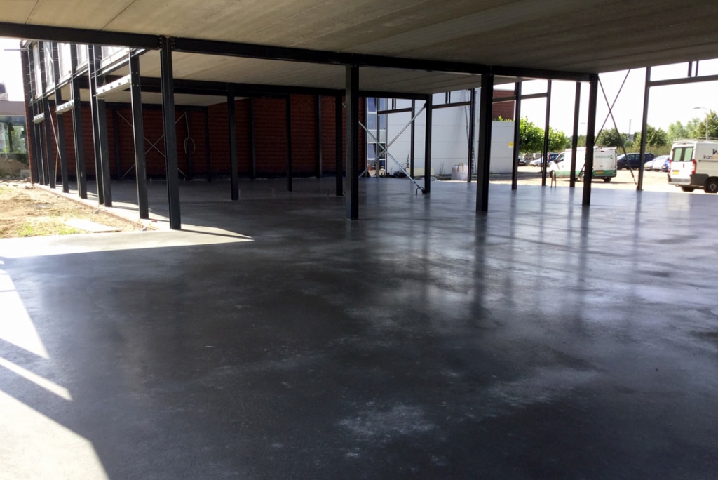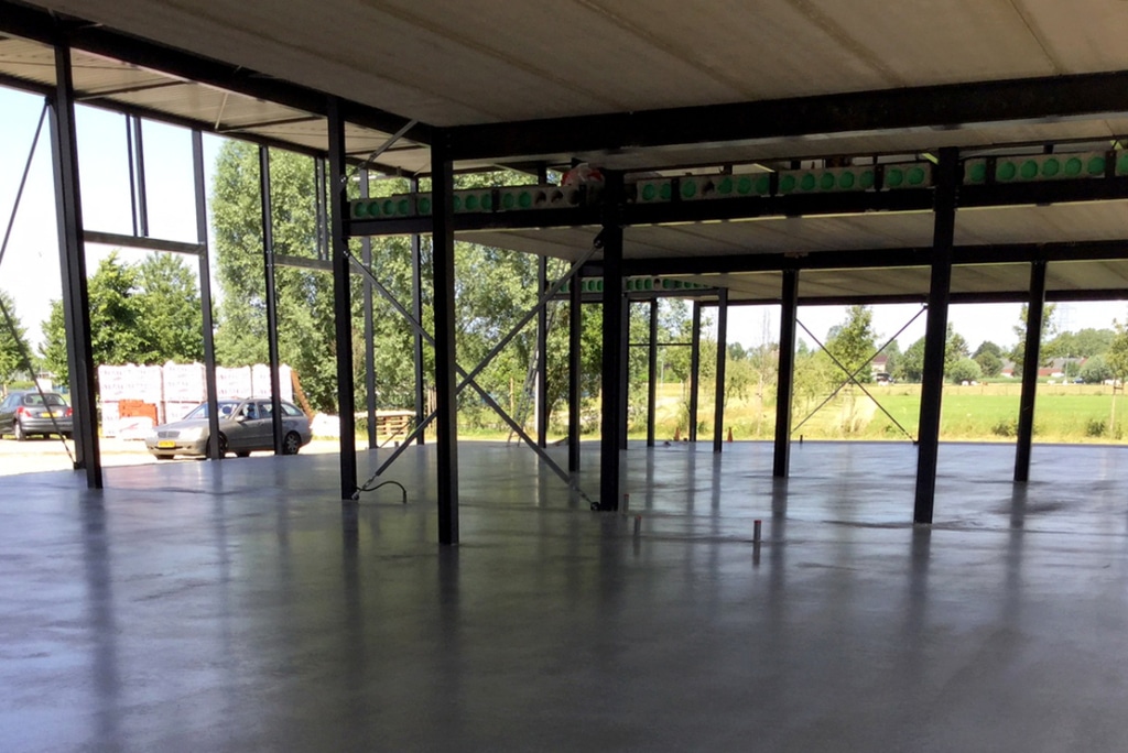 Nachdem das Gebäude wind- und wasserdicht gemacht wurde, wird der Boden von uns in traditioneller Betonbauweise hergestellt. Die Pfahlköpfe werden gereinigt, Unterbetonböden hergestellt, Bewehrungsmatten eingebaut und anschließend wird der Beton gegossen. Der Boden wird einige Stunden nach dem Gießen, wenn er ausreichend ausgehärtet ist, geglättet (mit einem Flügelglätter). Nach ca. 24 Stunden ist der Boden begehbar und nach 28 Tagen uneingeschränkt als Werkstatt nutzbar.
