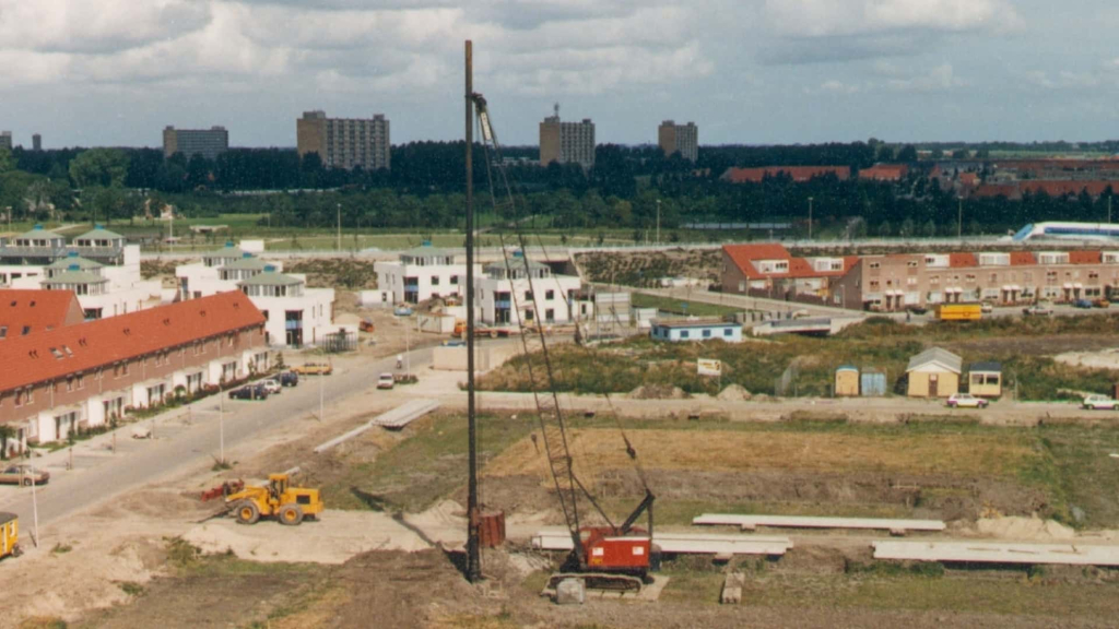 Driving pre-cast piles with a diesel ram in Purmer-Zuid, adjacent to the Montessori school with, in the background, the aircraft (DC8) in the Leeghwaterpark. This once stood on the site now occupied by the Leeghwater swimming pool car park.