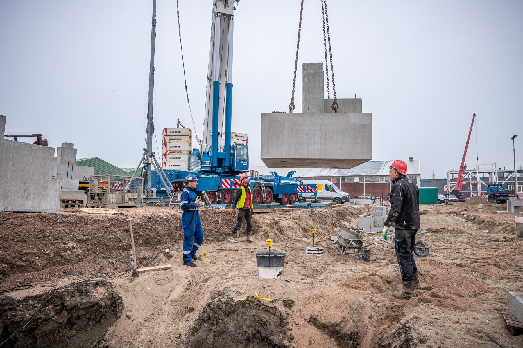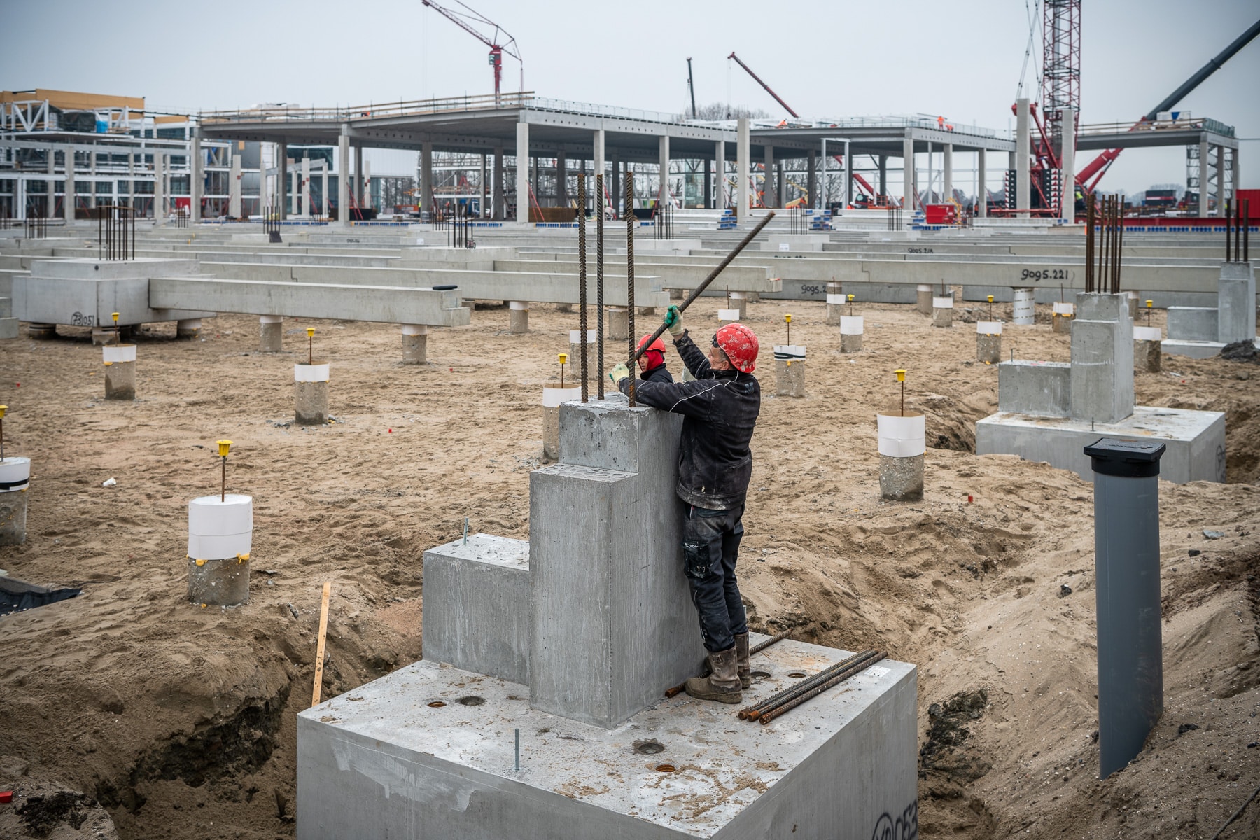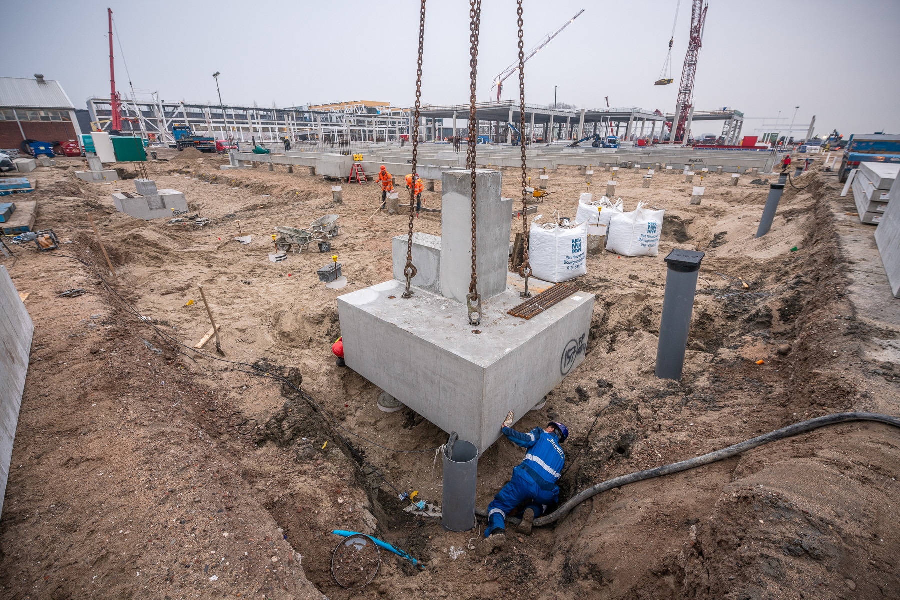 Vroom offers a complete foundation package that usually ends at the top of the ground floor. The precast foundation blocks are often combined with precast foundation beams, precast lay-down areas, dimensioning and the installation of the ground floors, including pouring. If necessary, a combination is made with in-situ poured concrete.