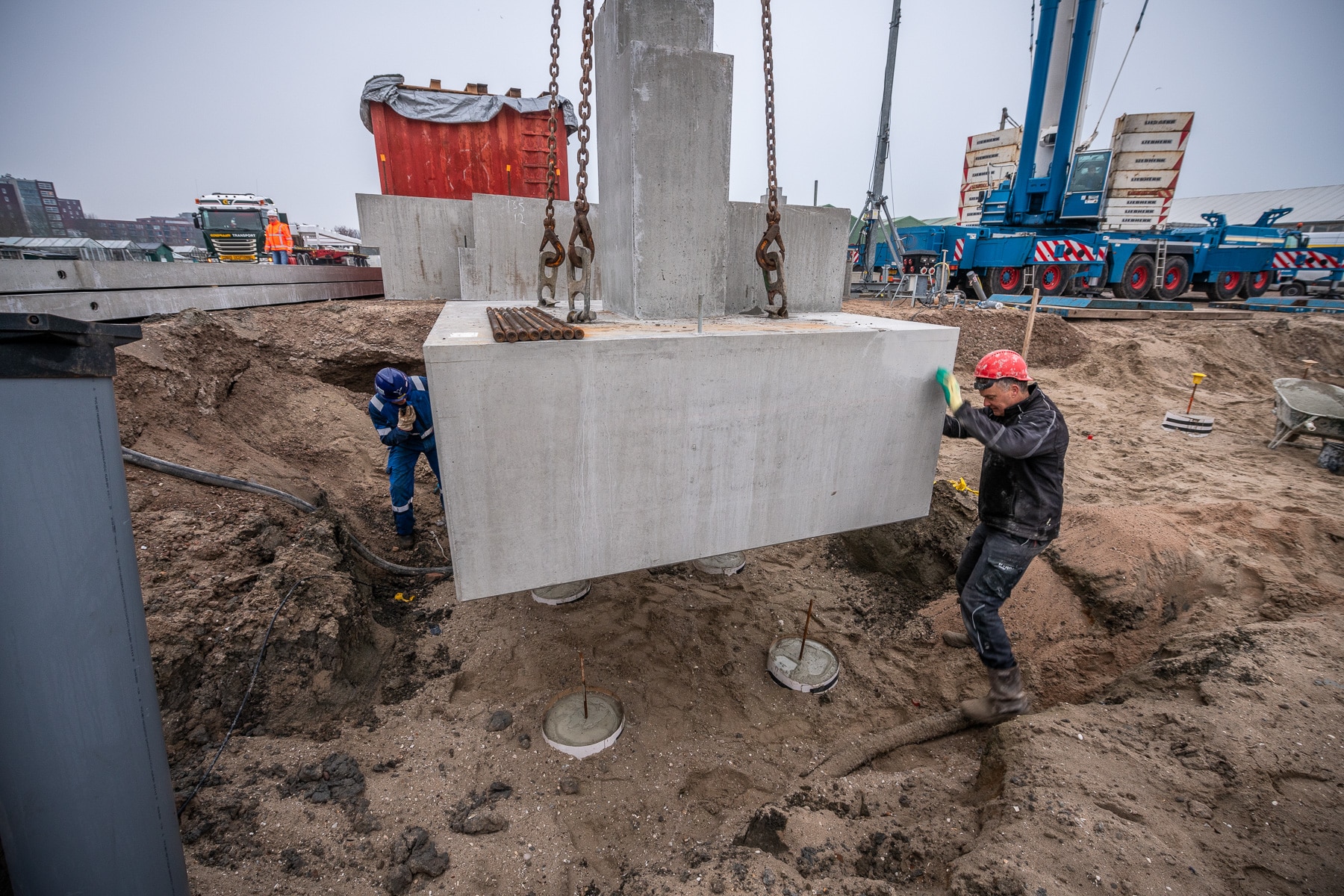 The precast foundation blocks are mounted with a telescopic crane or mobile crawler crane, depending on the element weights and the distance at which they need to be placed.