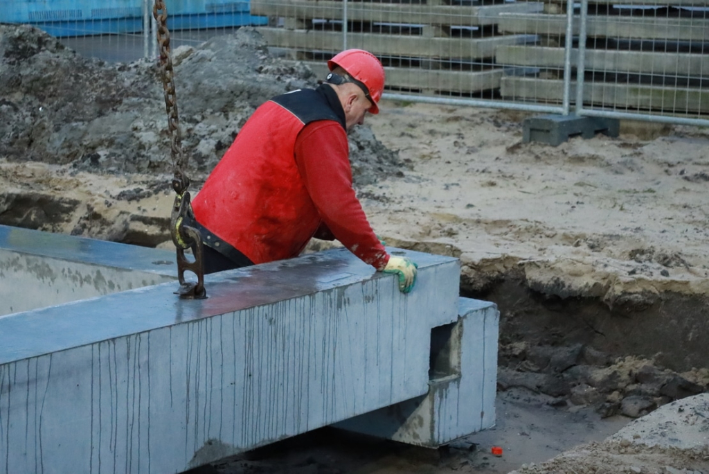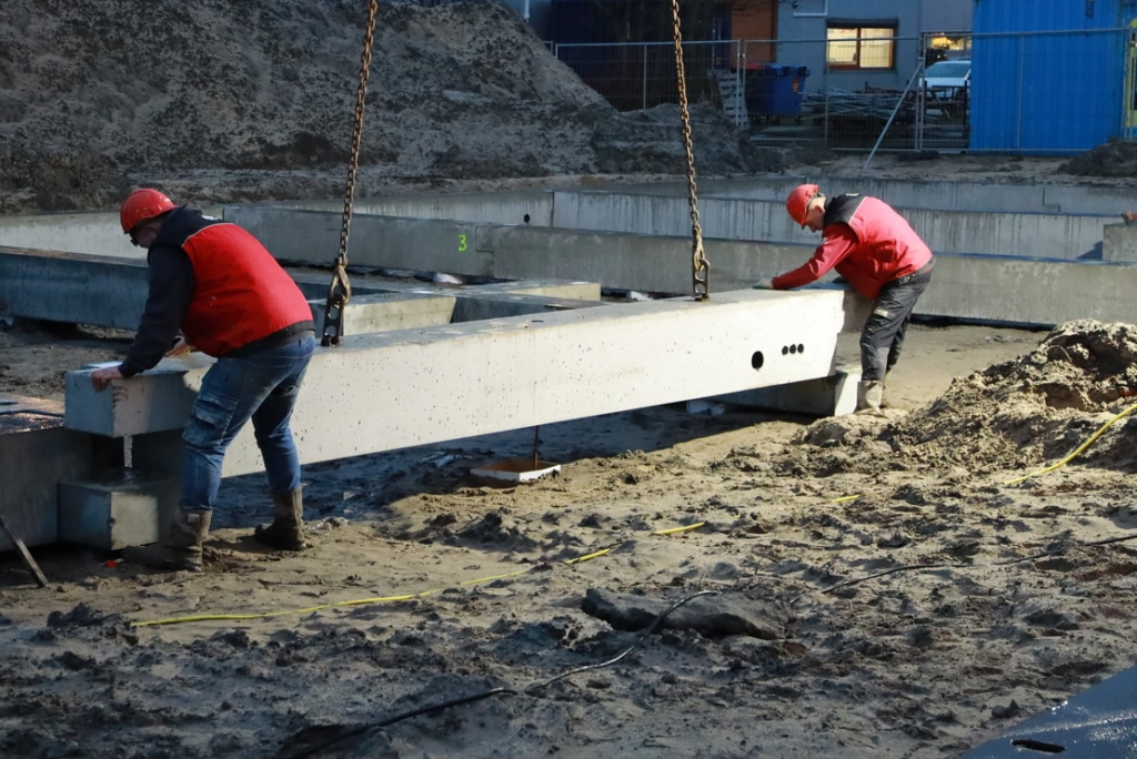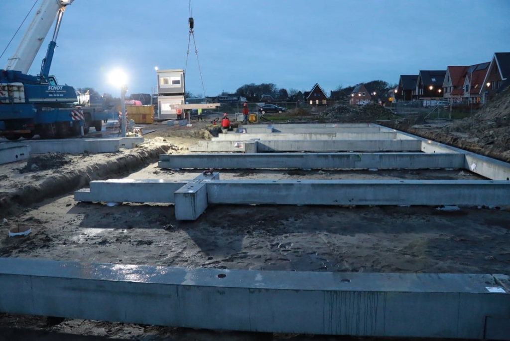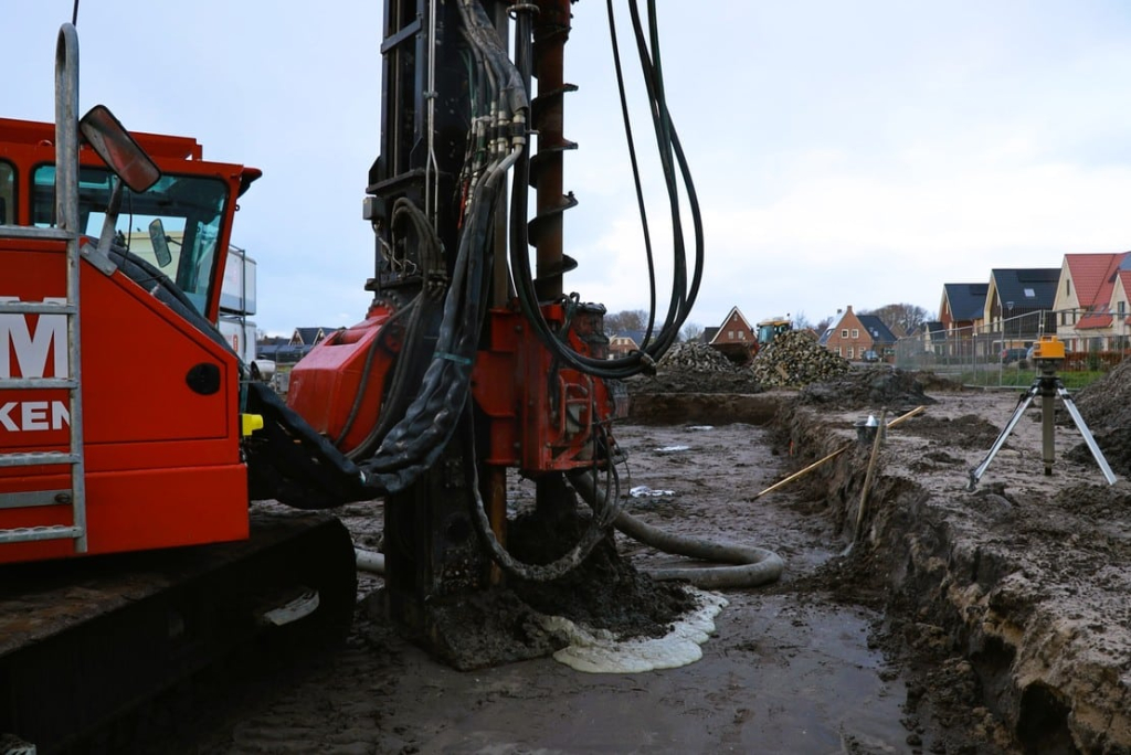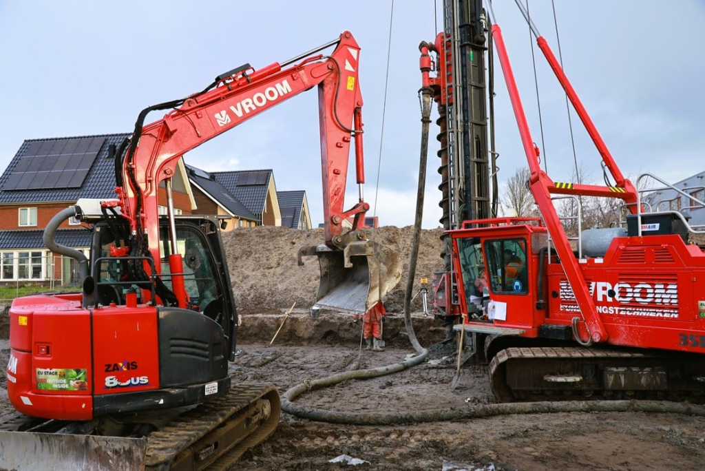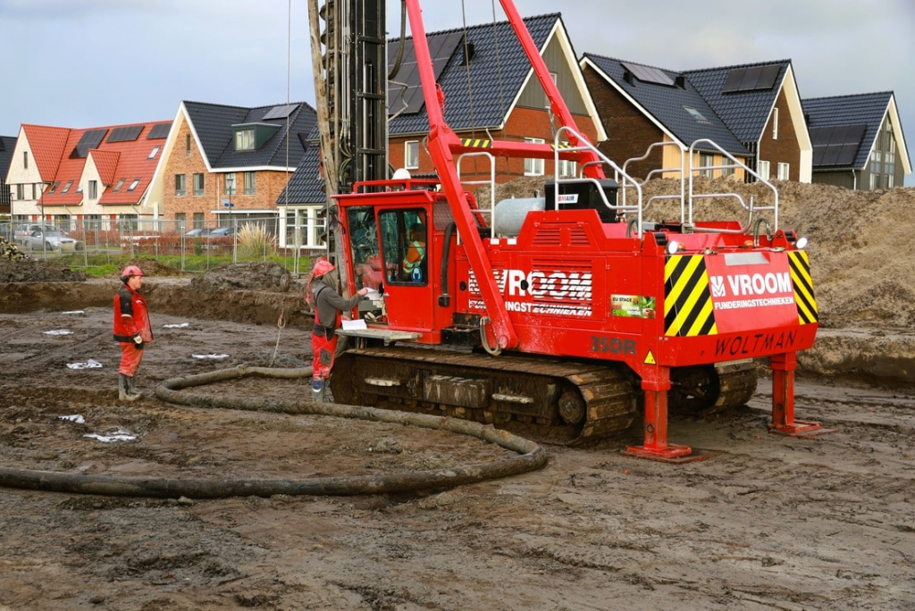 Groundwork combined with suction pumps and drains is crucial. The combination of concrete screw piles and prefab foundation beams means the working level must be 4 cm below the bottom of the foundation. Precise handling by the groundworker and Vroom’s drilling team is essential. Excellent communication among all parties involved plays a significant role in the smooth progress of the project.