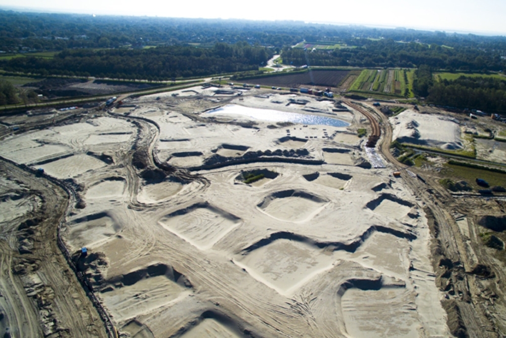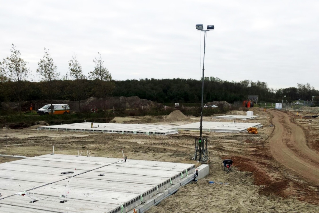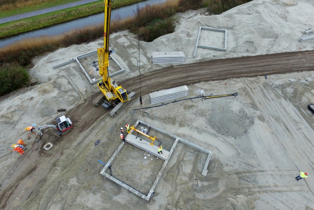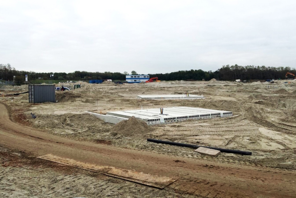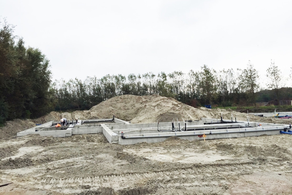 The foundation of the homes consists of prefab foundation beams. In addition to the foundation beams for the homes, beams for the garden walls have been mounted. The beams have been equipped with transits so that the installation systems can be connected to each other underneath the homes.
