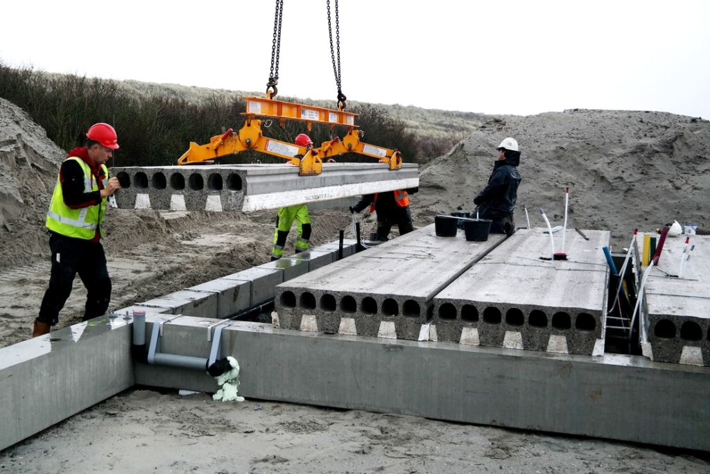 On top of the foundation, we will also mount the hollow-core slabs. These floors will be left as piles alongside the construction road by the deliverer and will be mounted by us on the right place on top of the home. As a lot of installation systems are located underground and through the floor to the installation systems inside the home, we have to collaborate with the plumber. After mounting each plate, the installation system is being mounted directly.