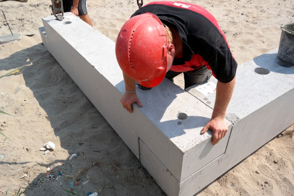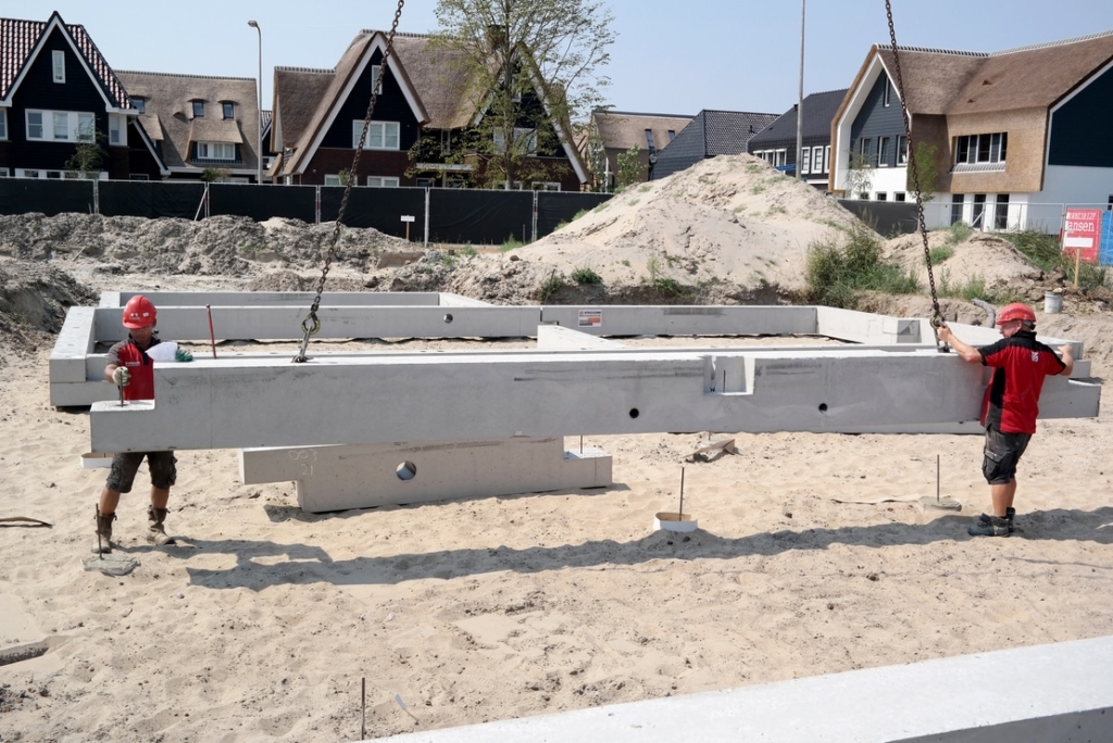 De prefab funderingsbalken worden gemonteerd met een telekraan of mobiele rupskraan, afhankelijk van de elementgewichten en de afstand waarop deze moeten worden geplaatst.