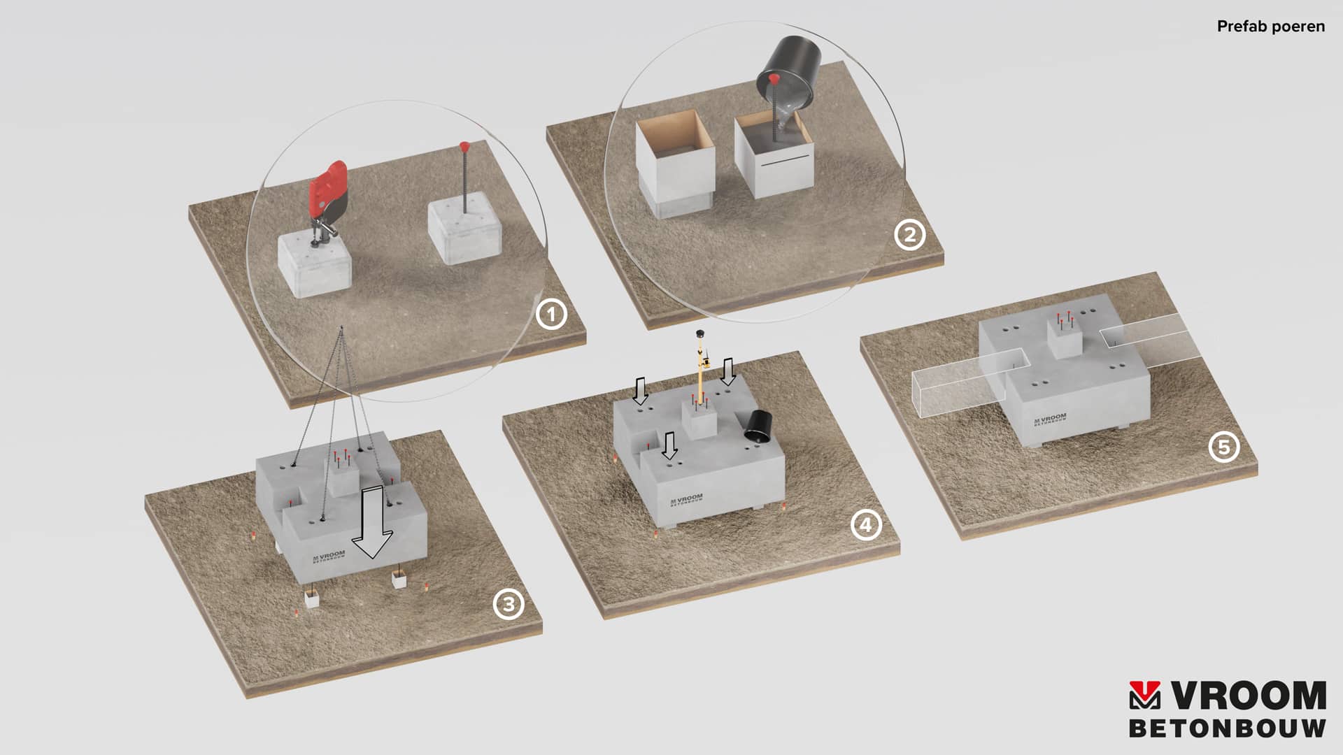 Vroom biedt een compleet funderingspakket dat meestal stopt bij de bovenkant van de begane grondvloer. De prefab poeren worden vaak gecombineerd met prefab funderingsbalken, bergingsvloeren, maatvoering en het monteren van de begane grondvloeren, inclusief het afstorten. Indien nodig wordt een combinatie gemaakt met in het werk gestort beton.
