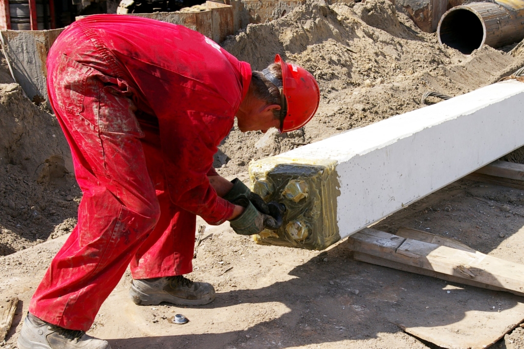 - Het groutmengsel wordt gedeeltelijk om het prefab betonelement aangebracht.