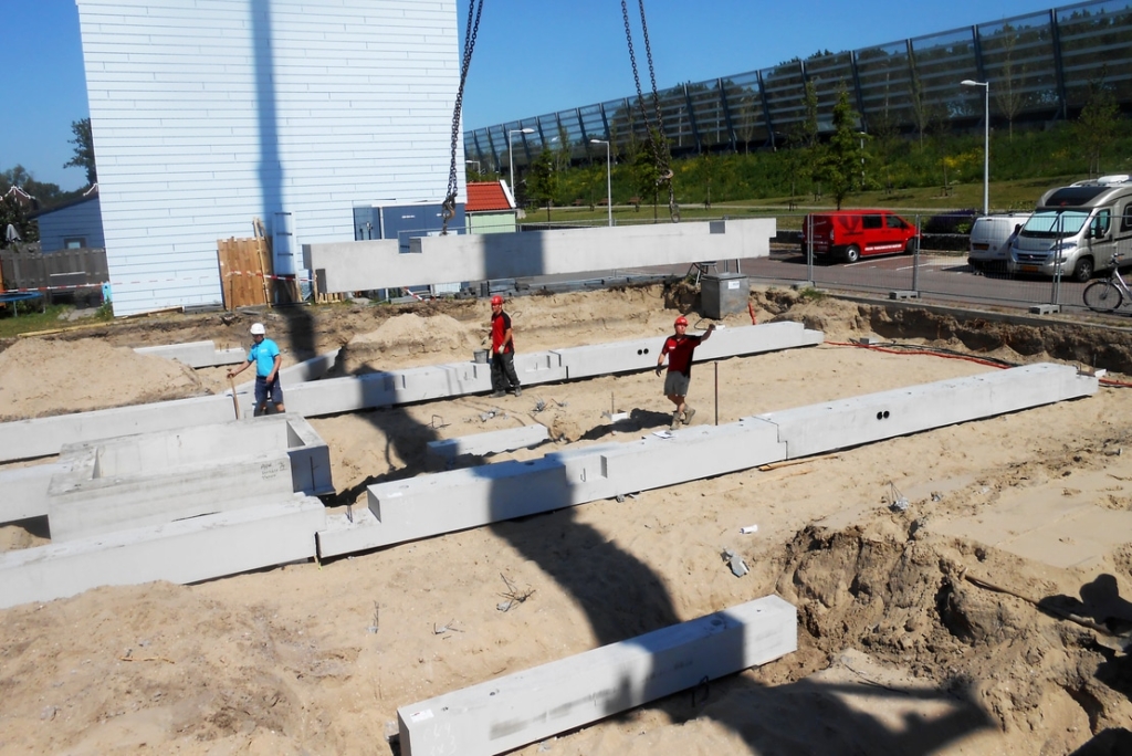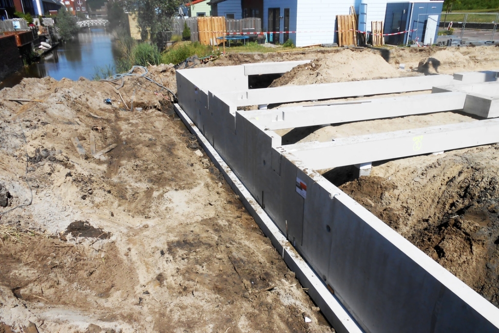 Als tijdelijke belasting is op de bouwlocatie een dikke laag zand aangebracht. Het heiwerk wordt bovenop die zandlaag uitgevoerd en de palen moeten dan ook een behoorlijk stuk verdiept worden weggeheid. Na het heiwerk is de bouwput ontgraven tot de onderzijde van de fundering, zodat meteen de kruipruimte is ontstaan. Aan de kant van de gracht is een prefab kademuur geplaatst. De hoge elementen moesten in een kort tijdsbestek worden gerealiseerd en daarom is gebruik gemaakt van prefab elementen. Vroom heeft de prefab fundering in één dag geplaatst.