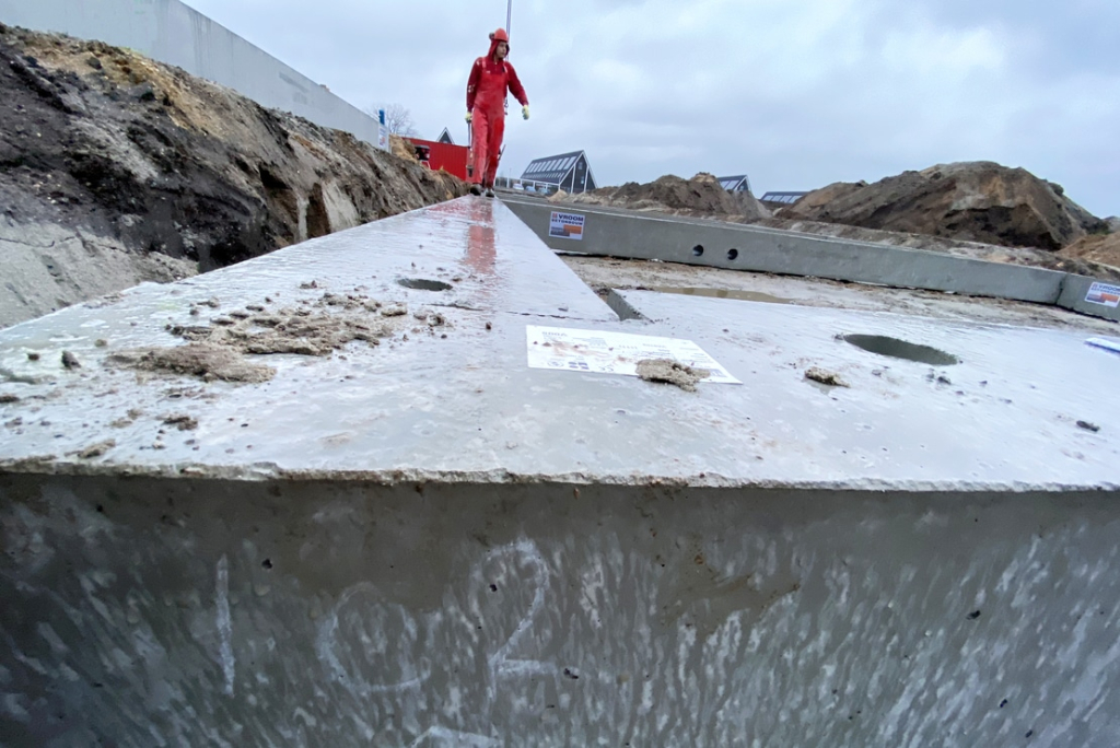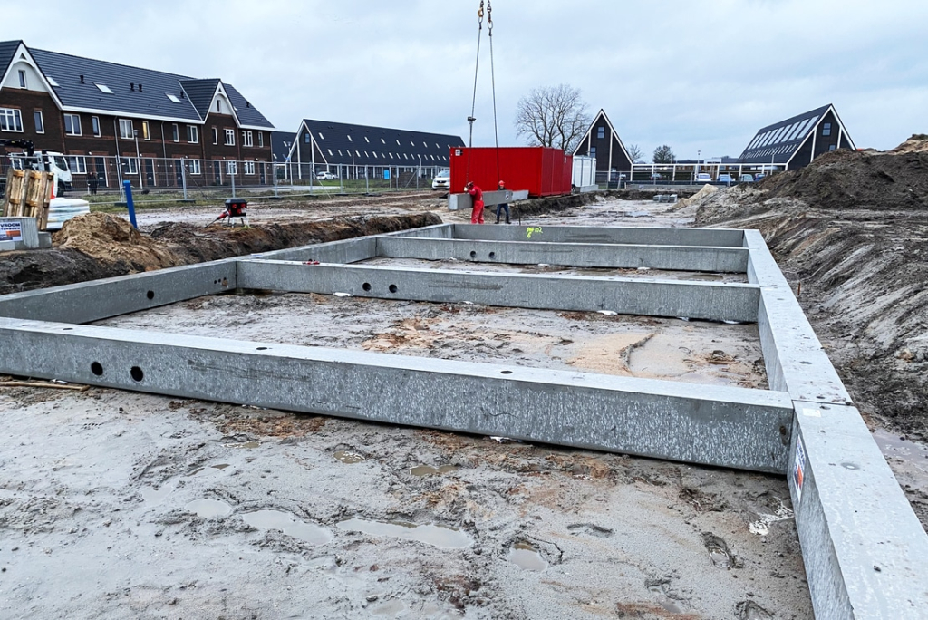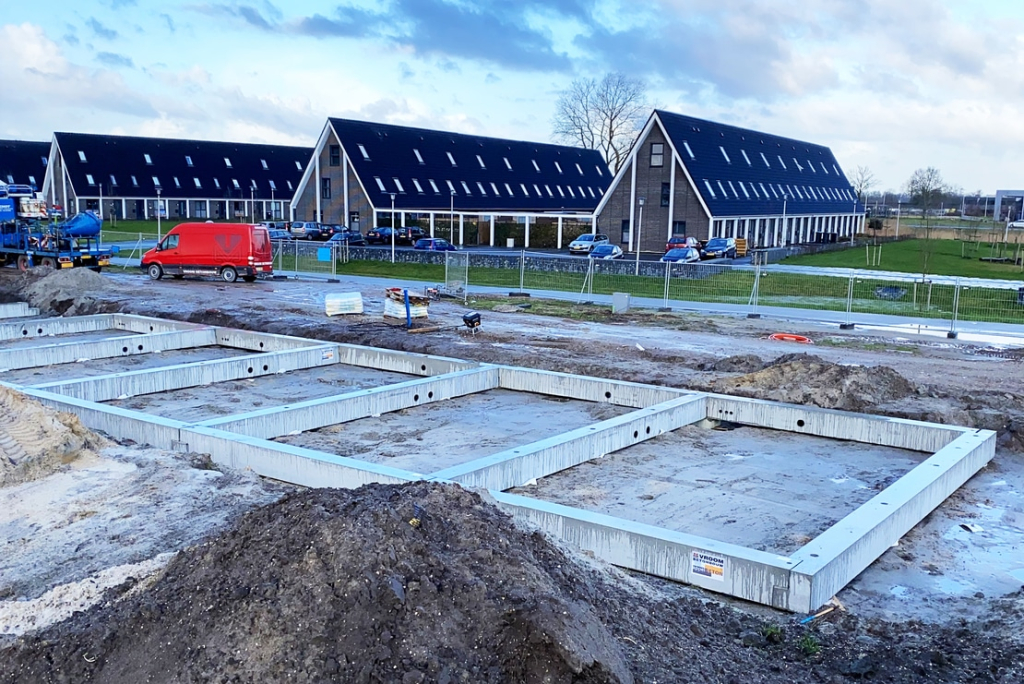 Ook de maatvoering voor het project ligt in handen van Vroom. Eerst is bepaald waar de woningen gepositioneerd moeten worden in de wijk. Daarna zijn de paalposities uitgezet en zijn de mortelschroefpalen aangebracht. Na uitharding zijn de posities van de palen waarop ze zijn gemaakt ingemeten en tegelijkertijd zijn de funderingsbalken gemaatvoerd. De montage van de funderingsbalken is door onze ploeg van 2 stelleurs gedaan, met behulp van een telekraan. Na de montage zijn de elementen fijn afgesteld en aan de palen gefixeerd door een stekverbinding.
