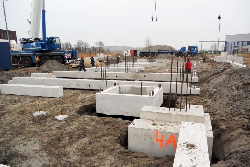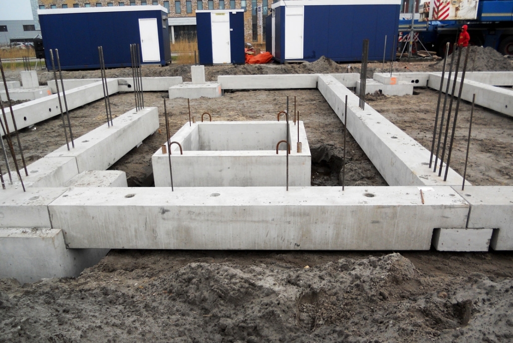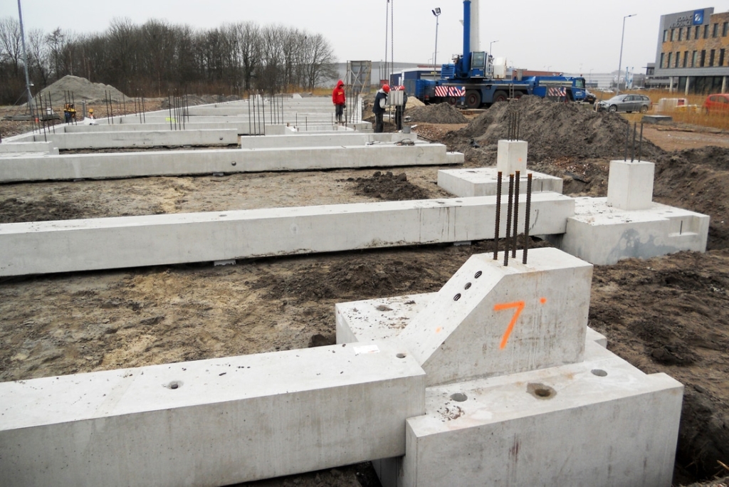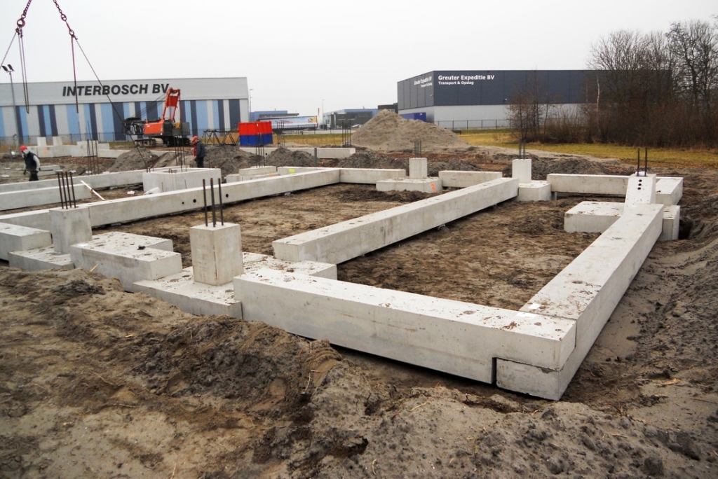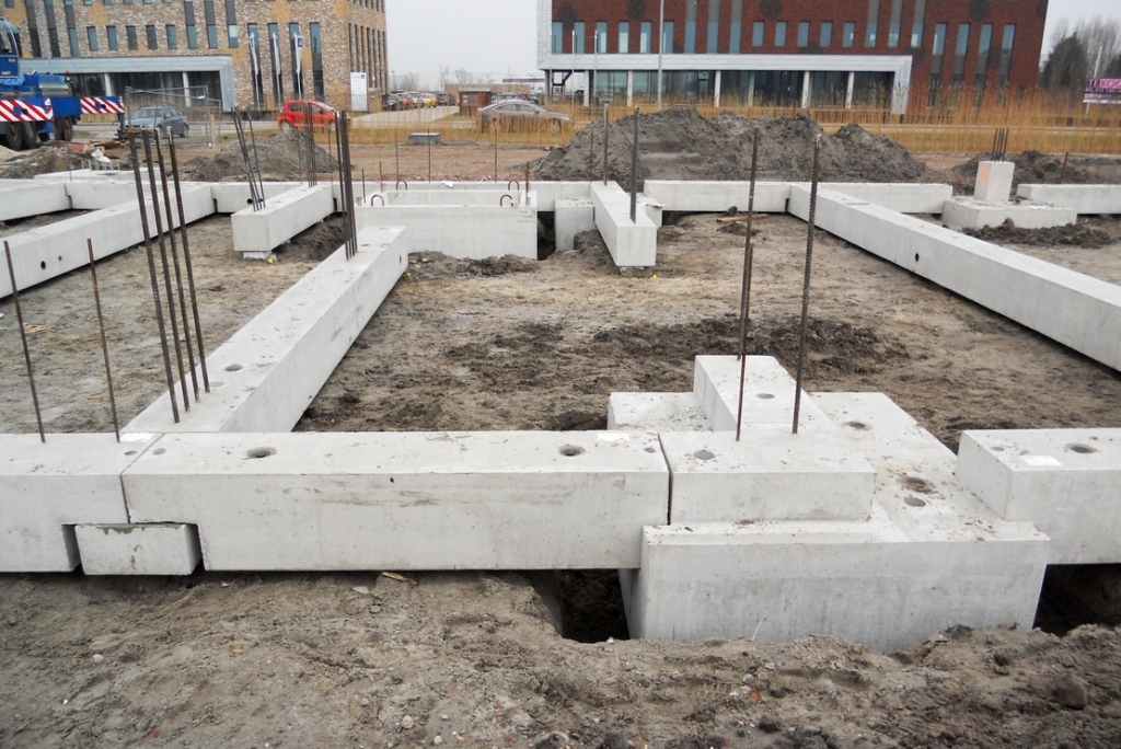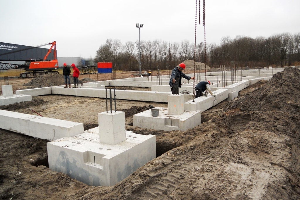 Allereerst zijn de poeren en liftputten gemonteerd, waarna de poeren met elkaar zijn verbonden door de tussenbalken te monteren. De fundering is uiteindelijk opgeleverd met stekken uit de funderingsbalken en complete ankerpatronen uit de poeren. Zo kon zonder hiervoor voorzieningen in de elementen te hoeven boren, de volledige prefab boven constructie aan de fundering worden verbonden.