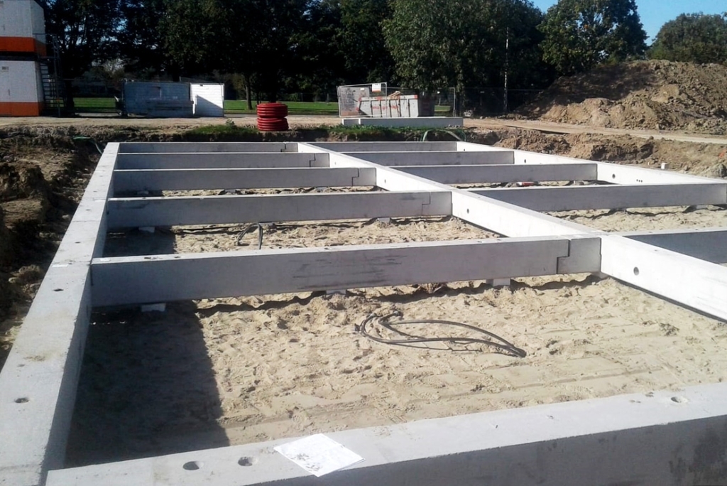 De fundering bestaat uit 129 funderingsbalken en 39 bergingsvloeren gemonteerd op 245 prefab betonnen heipalen. Door Vroom zijn de palen na het heien op de juiste hoogte gemaakt en zijn de stekken in de paalkoppen geboord. Door deze stekken worden de funderingsbalken verbonden met de palen. Bij het monteren van de funderingsbalken worden deze over de stekken heen geplaatst. Als dit klaar is, worden ze aan de stekken gefixeerd met gietmortel. De uitvoering van het project ligt in handen van Ouwehand Bouw.
