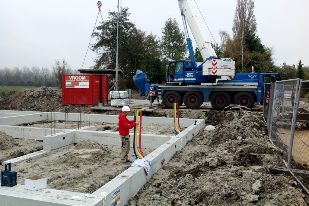 Tijdens het monteren van de prefab fundering was de loodgieter aanwezig. Direct nadat de eerste funderingselementen waren geplaatst, heeft de loodgieter het leidingwerk door en langs de prefab fundering gemonteerd. Deze samenwerking zorgde ervoor dat de vloer aansluitend aan de werkzaamheden van de loodgieter kon worden gemonteerd.