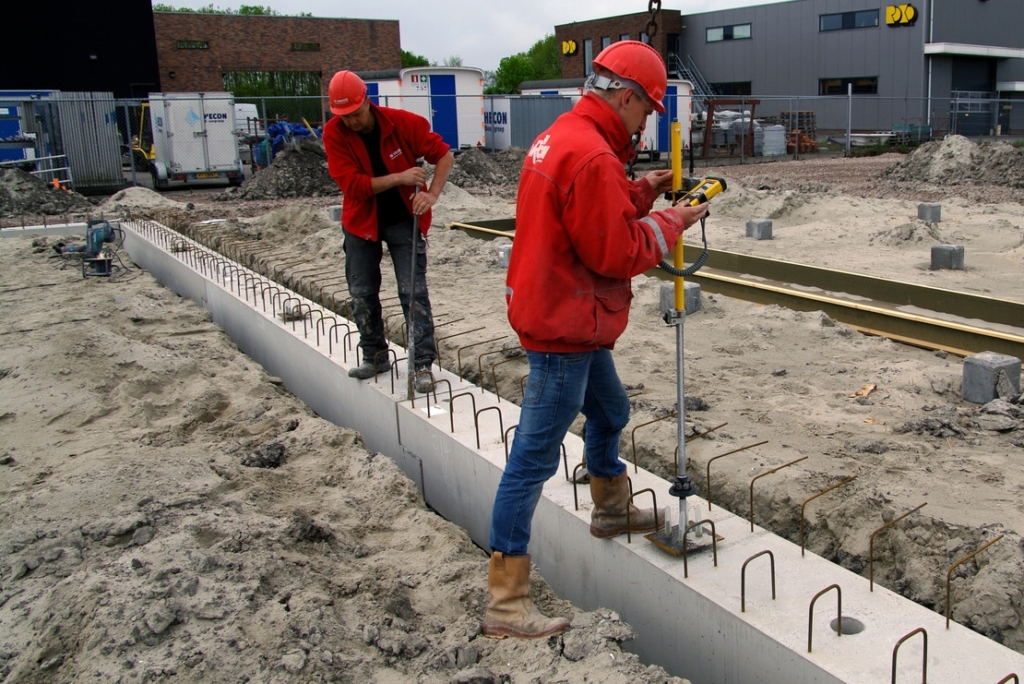 De montage van de funderingsbalken is begeleid door de meetdienst van Vroom die ieder element op de gewenste ankermaat op zijn plaats begeleid. In dezelfde wee k isde prefab fundering afgemonteerd (vast gegoten met gietmortel) en opgeleverd.
