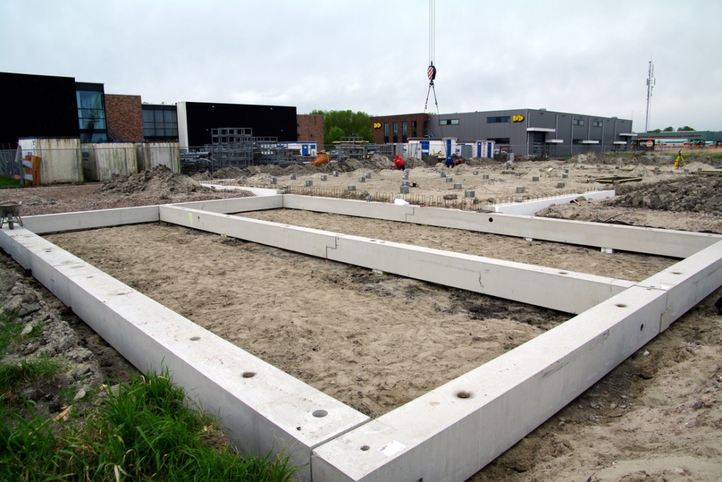 Uithardingstijd is niet van toepassing waardoor direct na het monteren van de prefab funderingsbalken gestart wordt met het plaatsen van de staalconstructie.