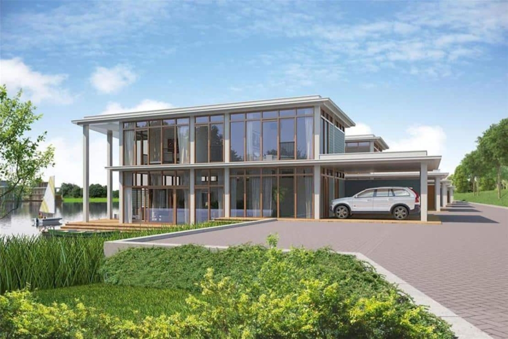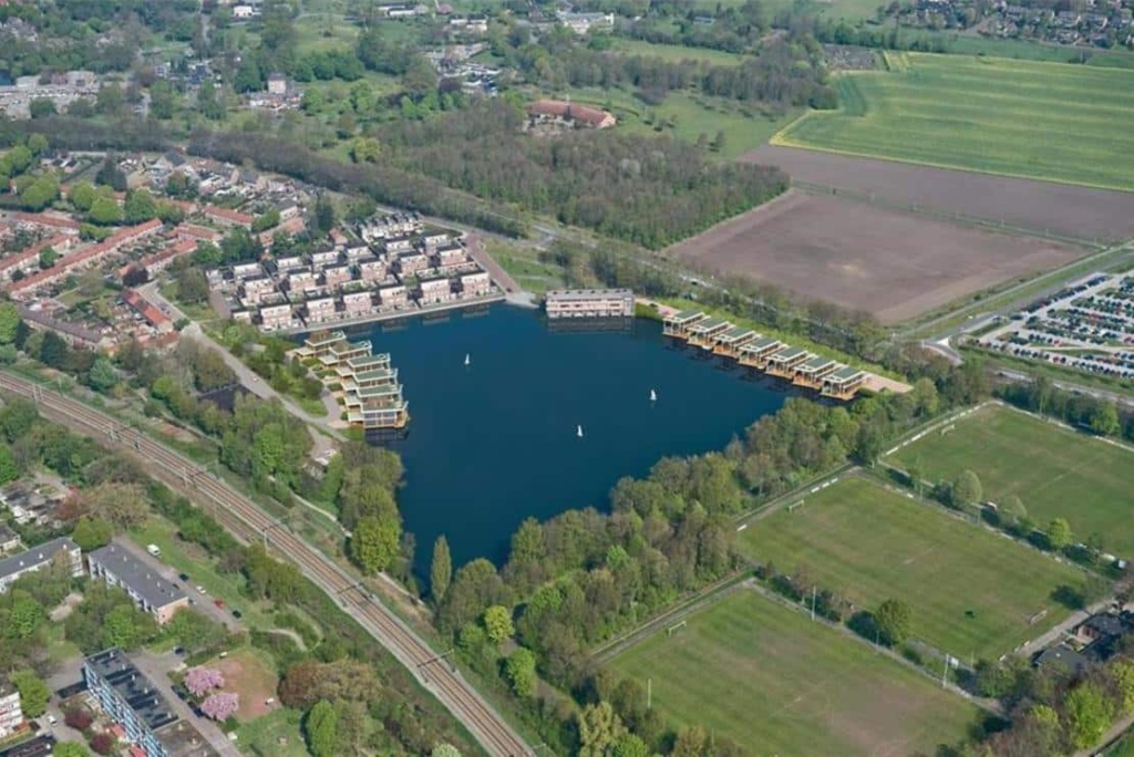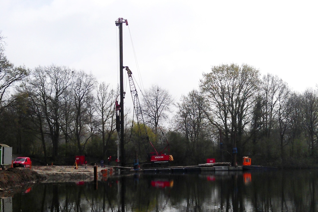 In totaal komen er 13 van deze villa’s in de kolk, alleen met de tuinen gericht op het water. Om de heipalen aan te brengen is de machine ter plaatste op een ponton (vlot) gereden. Met de machine aan boord is naar de plek gevaren waar de palen geheid moesten worden. Daar is het ponton geborgd middels stalen palen welke dienen als ankers.