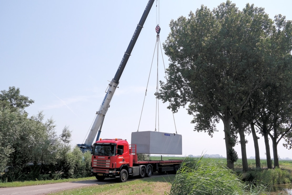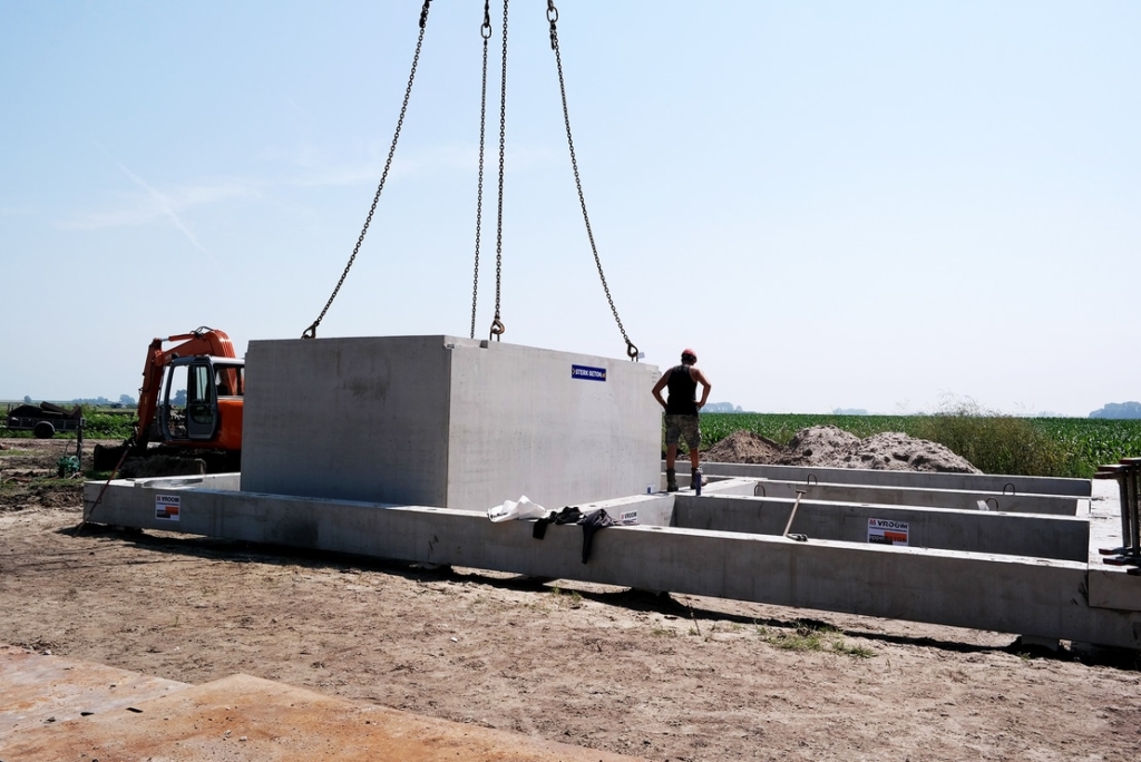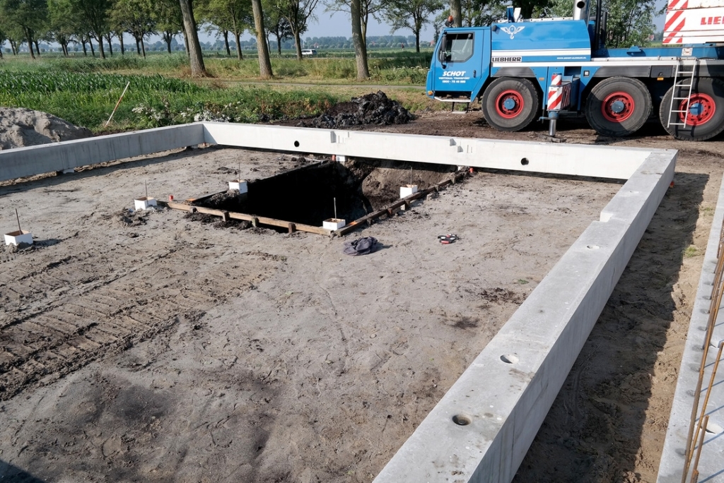 Nooit eerder plaatste Vroom kelders van een dergelijk grote omvang. Deze zware jongens wegen 14,1 en 19,4 ton. De kelder van de woning bedraagt 4,4 x 2,6 x 2,5 meter en de kelder voor de schuur is 5,6 x 3,2 x 2,5 meter.